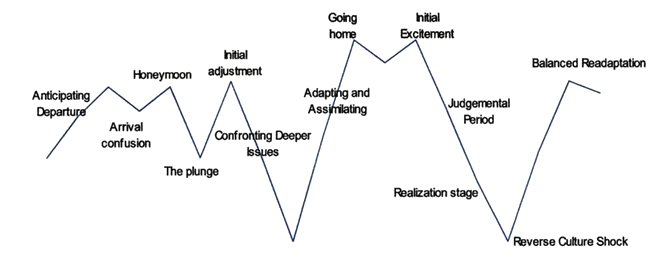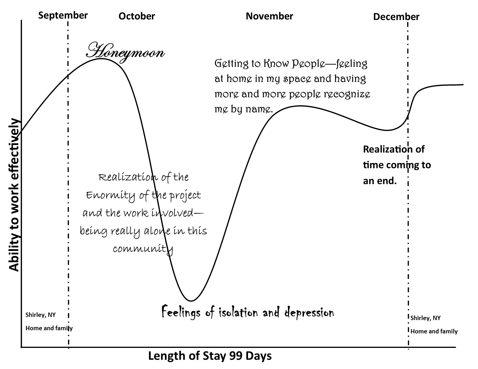 Culture Shock chartThis one is mine and specific to my time here in England. The chart below is a longer range look at culture shock experience. So, let’s walk through the experience. It is my hope that this discussion will add to the much-needed personal experience narratives and dialogue about the subject for anthropologists, specifically, but, also for others who are sojourning in other countries, cultures, and climes (Irwin 2007).